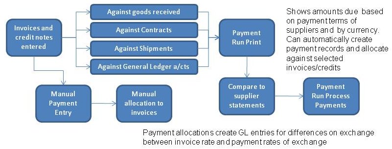 A primary function of the system is to track the amounts owed by the business to suppliers in both local and foreign currency. The system shows, invoice-by-invoice, the balance on the account and does not lose the detail of what makes the account up in a balance brought forward - it is an "open item" system. When payments made to suppliers are entered and allocated to invoices, the differences on exchange are calculated and posted to the general ledger - that is only if integration to the general ledger is enabled from the company preferences page under the setup tab.