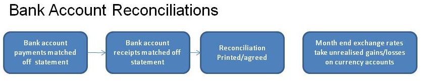 Certain general ledger accounts can be defined as bank accounts - as many bank accounts as needed can be defined. At the time of defining a general ledger account as bank account the currency of the bank account must also be specified. General ledger accounts defined as bank accounts can be reconciled to bank statements using the matching facilities - all receipts and payments show in the currency of the bank account for easy matching off statments. Entries made to bank accounts using receipts or payments, also create a total receipt or payment, which is retained for the purposes of matching off the bank statements. Using the bank payments page, general ledger payments can be analysed to any number of other general ledger accounts, but only one entry to the bank account is made. This page also allows payments to supplier accounts to be created. Similarly, using the receipt entry page, a series of receipts from customers which may all have been banked together can be deposited as one amount to a bank account. There is only one amount appearing on the statement as the total of all these receipts, this bank account transaction is created and available for matching deposits off the bank statements.