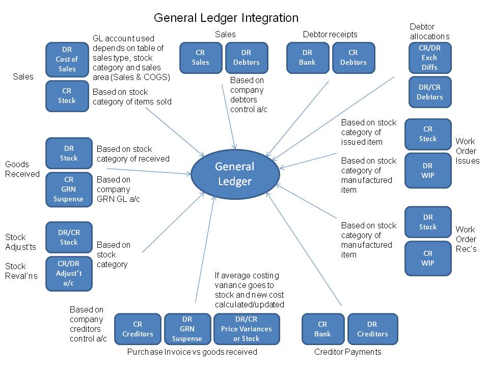 The general ledger is the accounting hub that is central to the "sub" ledgers for creditors (Accounts Payable), debtors (Accounts Receivable) and stock (inventory). All entries in the sub ledgers are also represented by entries in the general ledger. It is the integration set-up that determines how entries in the sub-ledgers are reflected in the general ledger. Most activity in the general ledger will be automatically created from the activity in the sub-ledgers with receivables, payables and stock administration.