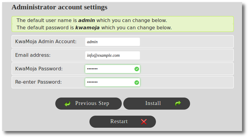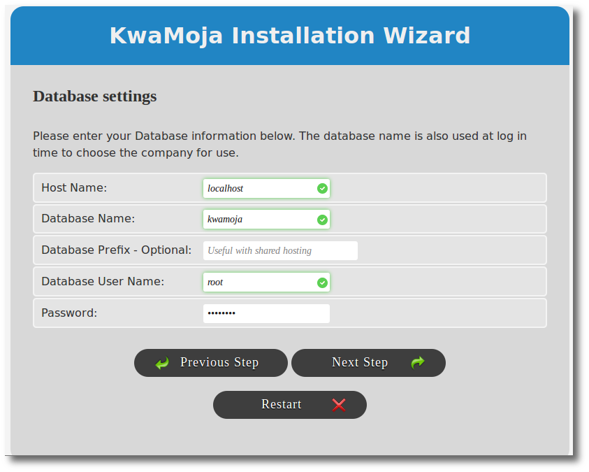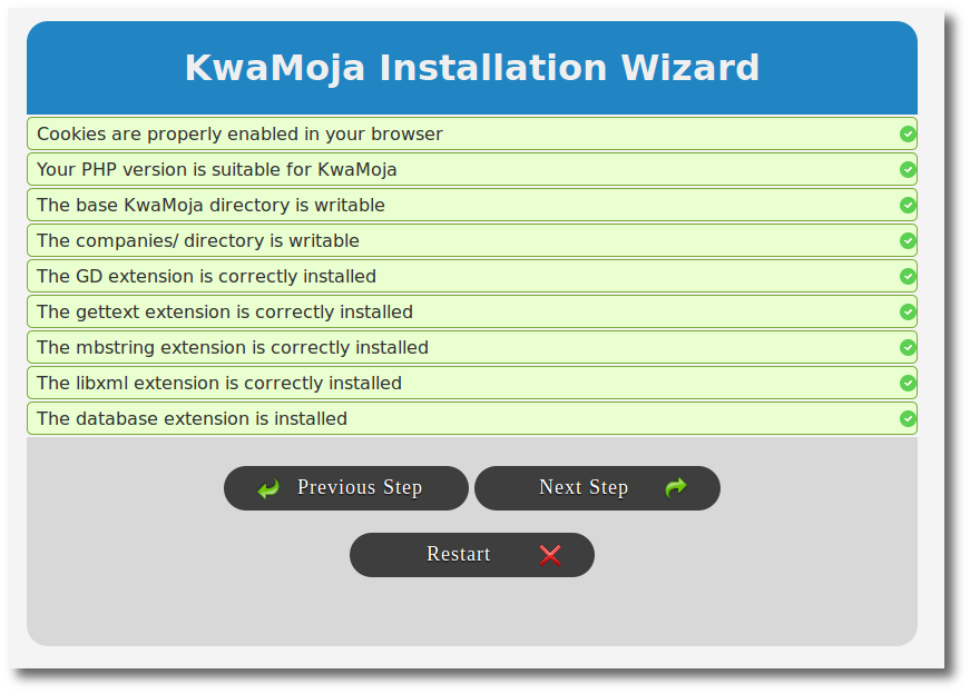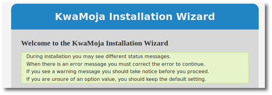 Assuming that a web server with PHP functionality is operational and a MySQL database server is available either on the same machine or on the network and that the web-server is running under a user that is able to write to the KwaMoja installation directory then a new installation can proceed.