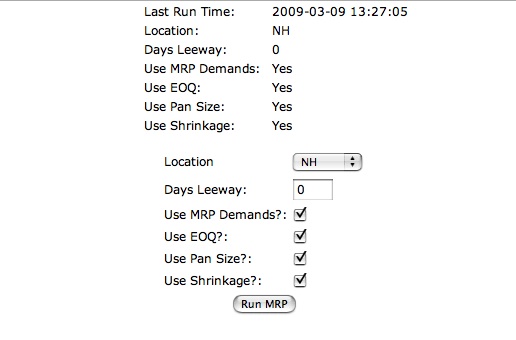 The program displays the last time MRP was run and the parameters that were selected for that run. There are check boxes to specify if MRP Demands are used in calculating the MRP and also if the EOQ, pan size, or shrinkage factor are used. The inventory location that should be used for the quantity on hand can be selected. Days leeway can also be entered and is used to determine if a purchase order or work order should be rescheduled; if the difference between a requirement date and the due date of the purchase order or work order is within the days leeway, then the order is not shown to need rescheduling.