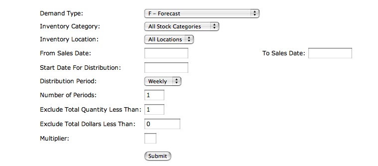 First, select the Demand Type for the demands that are to be created. Next, enter the selection criteria for the sales orders, which would be the inventory category, inventory location, and the date range for the sales orders. Next, enter the Start Date for Distribution, which is the due date for the first demand record that will be created, and then select the type of distribution period – weekly or monthly – and the number of periods the total quantity will be distributed over. Parts can be excluded based on their total quantity or the sales amount. A Multiplier can be used that multiplies the total quantity for each part by that number; an example of its usage would a case where you wanted to create demands for the next 18 months, but rather than just entering a date range for the previous 18 months, you entered a date range for the last 6 months and used a Multiplier of 3 so that it would use the latest sales patterns. To clarify how the whole program works, the user enters the selection criteria for the sales orders, the program finds the total quantity for each part, and then creates demand records that distribute that quantity for the type and number of periods entered. If a part had a total quantity of 12 and the number of periods selected was 12, 12 records with a quantity of 1 would be created; if the total quantity were 3, records with a quantity of 1 for the first 3 periods would be created; if the total were 15, the first 3 records would have a quantity of 2 and the last 9 would have a quantity of 1. After the demands are created, they can be edited or deleted using the Master Schedule program, selecting either by part number or Demand Type.