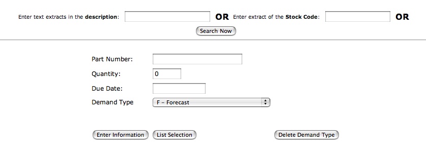 To enter a demand, type in the part number, quantity, and due date, select the Demand Type, and press the Enter Information button. Pressing the List Selection button displays multiple records. If the part number field is blank, all demands for the selected Demand Type will be displayed. If a part number is entered, all demands for that part number will be displayed. When the demands are displayed, there are buttons to press to edit or delete that particular demand. Pressing the Delete Demand Type button deletes all demands for the selected Demand Type.