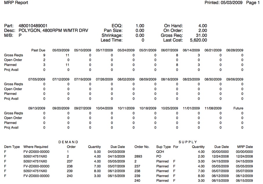 MRP produces several reports that are under Manufacturing -> Inquiries and Reports. MRP Reschedules Required shows the work orders and purchase orders that, according to the MRP, need to have adjustments made to their due dates. MRP Suggested Purchase Orders and MRP Suggested Work Orders show the orders that MRP has determined should be created to cover demands. MRP Shortages shows all of the parts that have an insufficient quantity to satisfy demand. One thing to keep in mind about this report is that if there is a shortage of a top level assembly, it shows on the report as well as the parts that make it up, so the total dollar amounts might be doubled. The inquiry simply called MRP is used to display all of the supply and demand information for a part.
